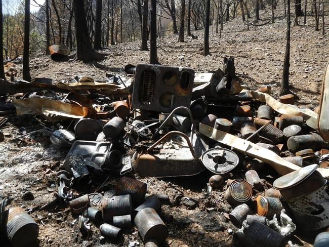 A small cabin untouched by the wildfire contained two bunk beds, food and water, reading material and other items, along with ammunition.