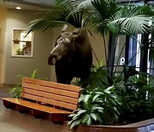 ANCHORAGE, Alaska – A moose wandered into a hospital building in Alaska’s largest city and chowed down on some plants in the lobby as workers watched the massive animal in awe.