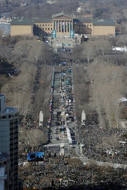 The parade began at the Eagles’ stadium complex and slowly made its way up Broad Street past the cheering throngs. Carrying the Lombardi Trophy, coach Doug Pederson walked part of the route — allowing fans to touch the gleaming hardware — while Lurie held a sign saying “THANK YOU FANS” as he stood next to the team’s three quarterbacks: Foles, injured starter Carson Wentz and third-stringer Nate Sudfeld.