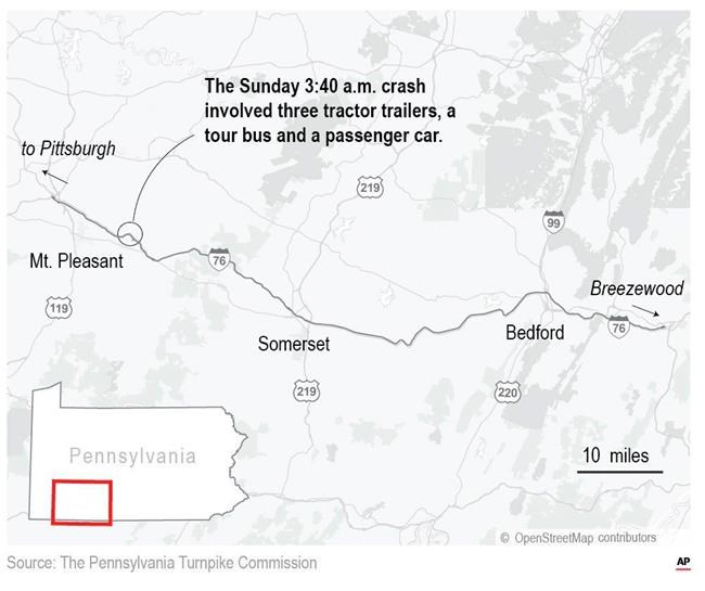 He said the bus, operated by a New Jersey-based company called Z & D Tours, was travelling downhill on a curve, careened up an embankment and rolled over. Two tractor-trailers then struck the bus. A third tractor-trailer then crashed into those trucks. A passenger car was also involved in the pileup.