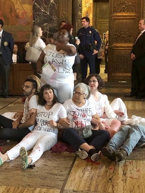 About a dozen abortion rights supporters protested outside the House chamber, objecting to the bill’s advancement, wearing clothes spattered in fake blood and shouting: “My body! My choice! Don’t you silence my voice!” The protest ended a half-hour later, when law enforcement officers took the group away in handcuffs. Ten people were arrested on misdemeanour charges of criminal damage to property and disturbing the peace, and then were released, said Louisiana State Police spokesman Maj. Doug Cain.