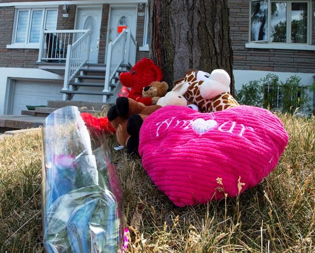 On Friday, a small pile of stuffed animals and a heart-shaped pillow sat beside a tree in front of the modest two-storey building in the Mercier-Hochelaga-Maisonneuve borough where the incident took place.