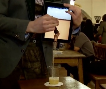 Yes it's a trick. His iPad doesn't really have beer inside. But we bet your can't figure out how he does it.