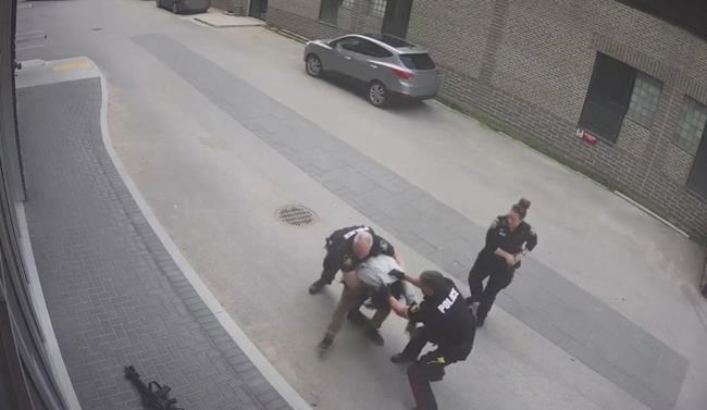 A blurry, 74-second video taken by a bystander and posted online Thursday shows three officers in Winnipeg struggling to turn a man on the ground over to handcuff him.