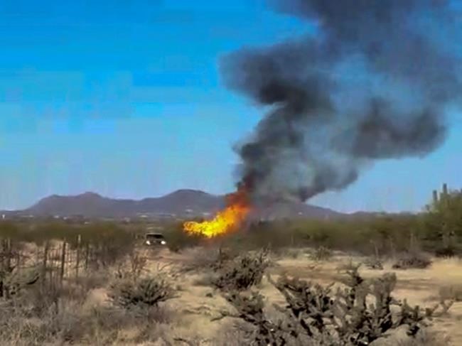 A witness video shows flames and a large plume of black smoke in an area of dry brush as several people on a dirt path look on.