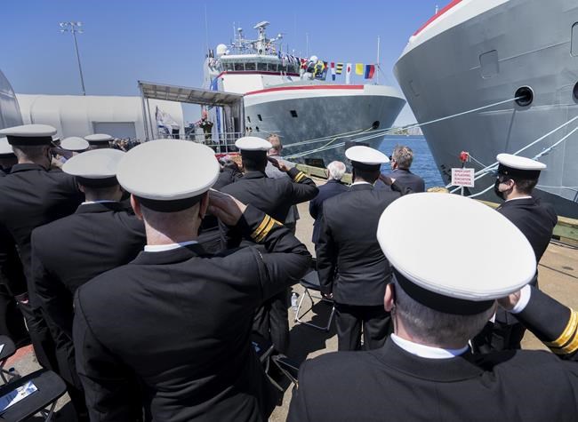 Both ships are part of a fleet of six Arctic and offshore patrol ships, referred to as AOPS, being delivered to the Royal Canadian Navy under the National Shipbuilding Strategy. The ice-capable ships are more than 100 metres long.