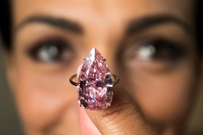 GENEVA – A vivid, pearl-shaped pink diamond said to be the largest of its kind to go under the hammer has sold at auction for 27.3 million Swiss francs ($28 million) at a Sotheby’s auction.