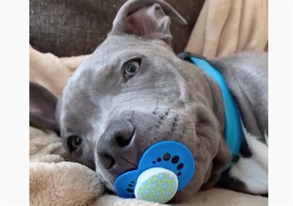 This adorable three-month-old Staffordshire bull terrier pitbull cross seems to really think he's a baby. The pacifier Louis' sucking on might have something to do with it.