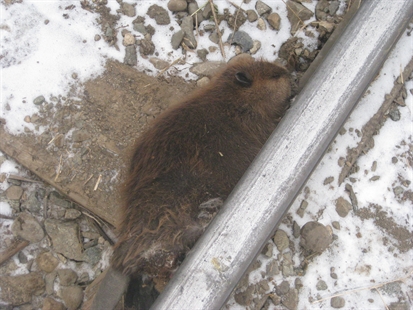 Debris spewed into the creek around a known beaver lodge. According to Blair, a juvenile beaver ran out to escape the destruction and while circling around on the tracks, was run over by the truck. The lodge may have been damaged, but Smith can’t tell for sure because a beaver dam looks like a pile of branches anyways.