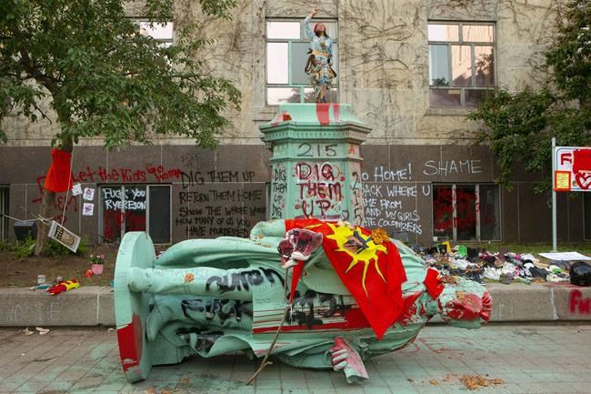 A statue of Egerton Ryerson on the university’s campus was torn down by angry protesters last summer in response to the discovery of what are believed to be unmarked graves on the grounds of a former residential school in Kamloops, B.C.