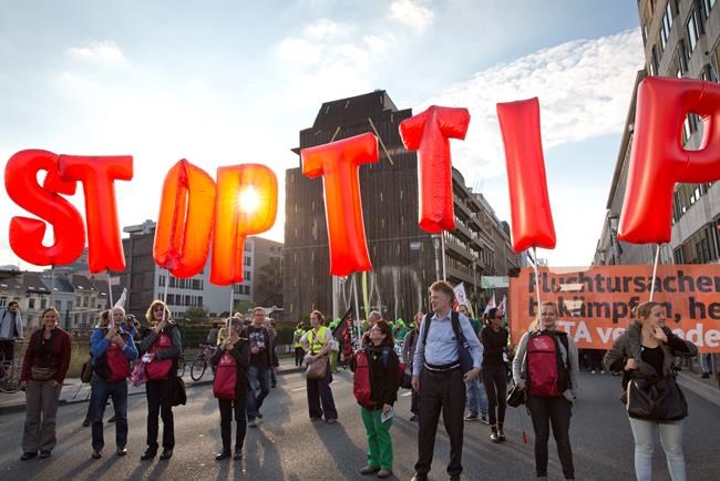 BRUSSELS – Thousands of demonstrators marched at the European Union headquarters on Tuesday to protest trans-Atlantic trade talks with the United States and a planned deal with Canada, claiming they would hurt labour and consumer rights while undermining environmental protection.