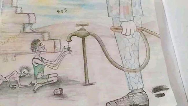 Libya’s migrant detention centres are rife with abuse, and many have gotten caught in the crossfire of the country’s civil war. One drawing depicts refugees in the crossfire between forces of military commander Khalifa Hifter and militias allied with the United Nations-supported government in Tripoli.