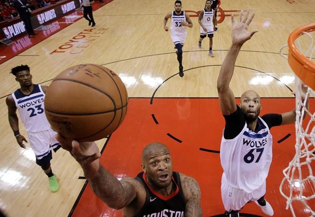 HOUSTON – Clint Capela had 26 points and 15 rebounds, James Harden added 24 points and the Houston Rockets pulled away in the third quarter to get another lopsided win and eliminate the Minnesota Timberwolves with a 122-104 victory in Game 5 of the first-round series Wednesday night.