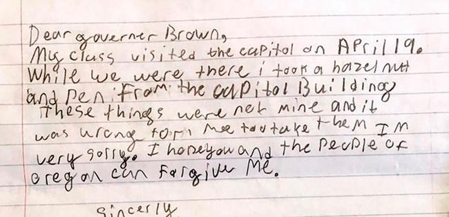 Gov. Kate Brown on Thursday tweeted out a photo of the boy’s apology letter along with the hashtag #cutestmailever and the caption, ‘I think we can forgive Samuel, don’t you think, Oregonians?’ The tweet immediately got many likes and retweets.