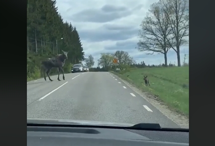 A cow moose crosses a busy road with her calf in tow when she realizes her baby has been stymied by the pavement.