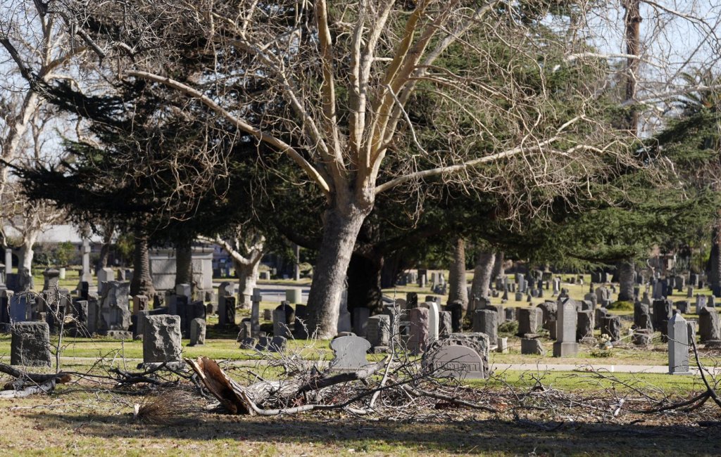 On Tuesday, crews were inside the closed cemetery, clearing away debris. Singed brush around the perimeter was the main sign of the fire’s toll, though the surrounding area was quiet, replete with damaged structures.