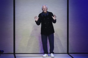 Giorgio Armani accepts applause at the end of the Giorgio Armani Prive Haute Couture Spring Summer 2025 collection, that was presented in Paris, Tuesday, Jan. 28, 2025. (AP Photo/Lewis Joly).