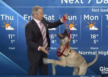 Take for example this effort by Global Edmonton's Mike Sobel to provide a weather forecast while his sidekick Ripple from the local humane society just wants to have fun. Word is Ripple was adopted the next day.