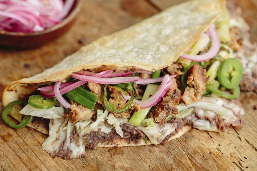 Oaxaca, Mexico, is home to the tlayuda, an oversize corn tortilla topped with black beans, cheese, meats and a spate of other ingredients. It’s often folded in half, crisped on a grill, and served with chorizo, thinly sliced grilled beef or pork, or grilled onion and green peppers. Hot sauces or an avocado salsa usually are offered on the side.