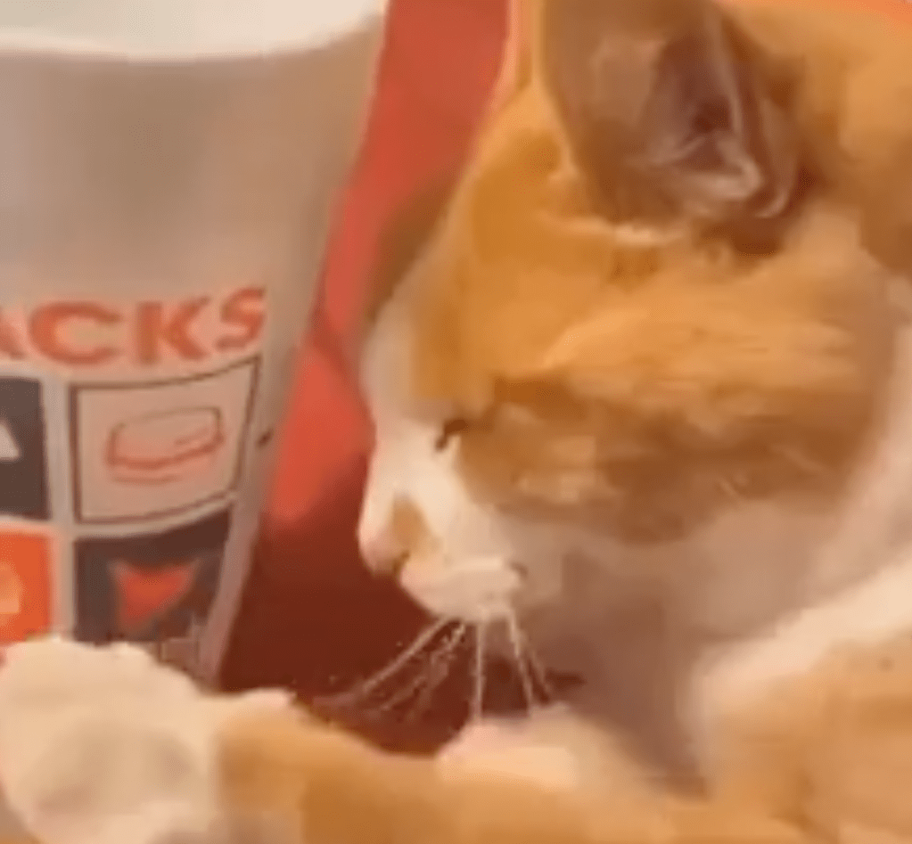 Well this cat believes he’s invisible as he closes his eyes and reaches for his human’s chicken nuggets.