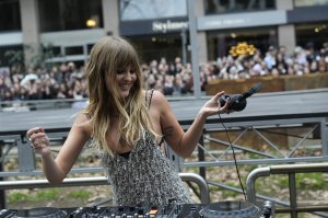 Shearling fur accented jackets and became panels on sheer dresses in a game of conceal and reveal. A big black faux fur was finished with a pair of glossy black leather bags belted at the hip. Leather and satin were draped to create new shapes in skirts and blouses.
