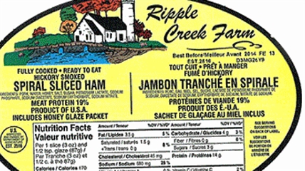 The product is labelled as Hickory Smoked Spiral Sliced Ham and distributed in British Columbia and Alberta under the brand of Ripple Creek Farm.