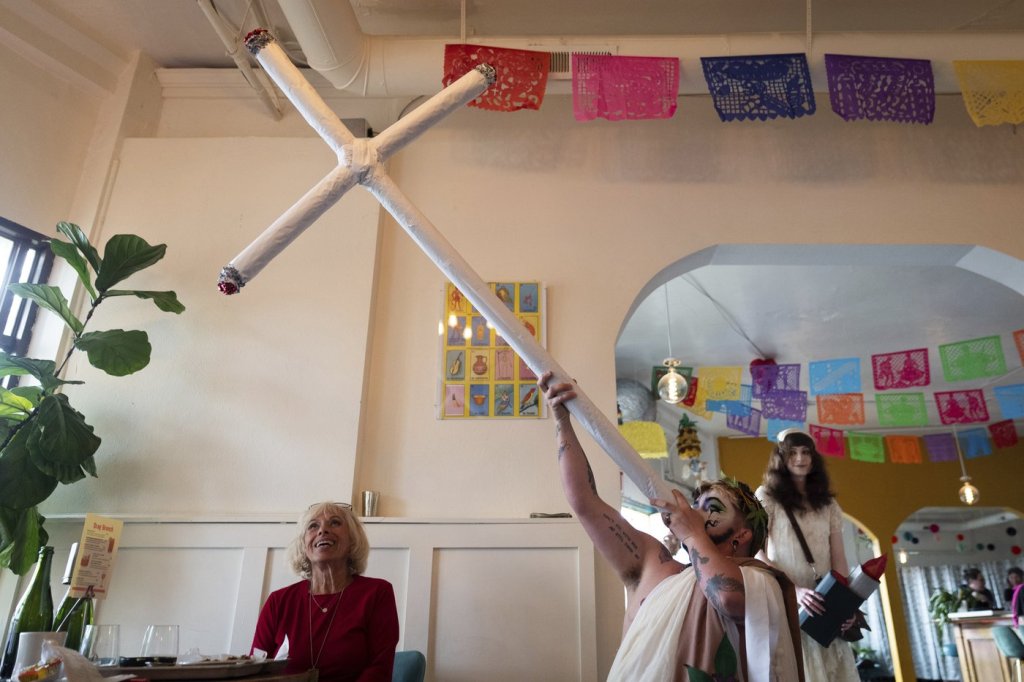 Bar owner Melinda Archuleta said the brunch was a dry run for hosting Pride month events in June. She herself doesn’t care much for marijuana, but as a Mexican American who has been influenced by Catholicism, she is interested in seeing the two cultures melded “in a cheeky way.”