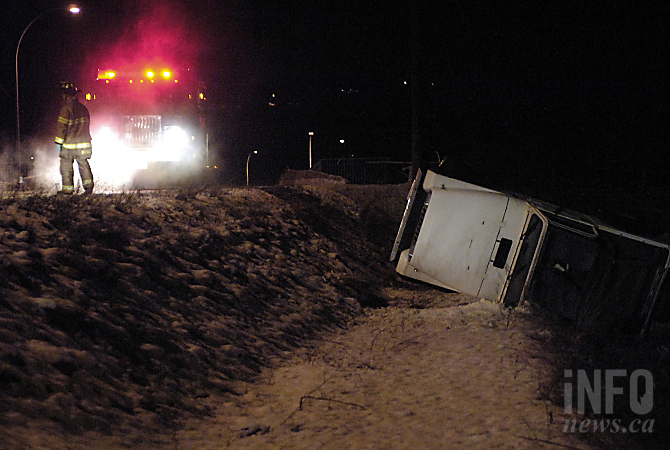 The accident happened between the roundabouts on Casorso Road when the driver lost control of her late model Jeep while travelling west. It came to rest at the bottom of a 2 metre embankment near Kelowna Driving Range around 9 p.m.