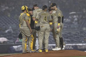 Padres manager Mike Shildt and Fernando Tatis Jr. were ejected during the rally by plate umpire Adrian Johnson. Tatis said something when he struck out swinging, a pitch after a called second strike at the bottom of the zone. Tossed for the 15th time in his managerial career, Shildt threw his lineup card and glasses while arguing.