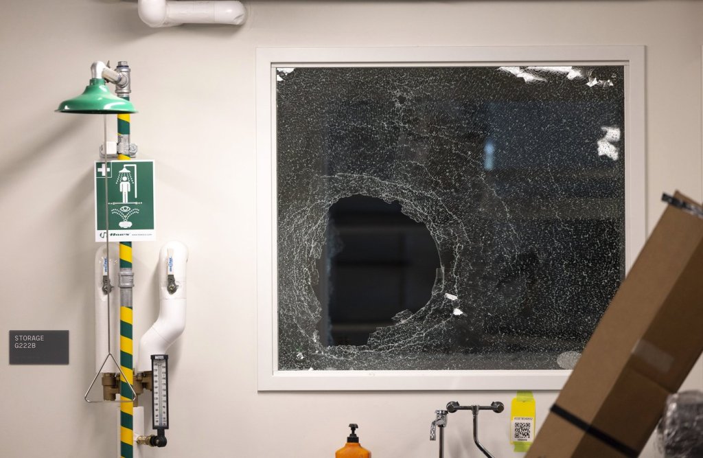 People dressed in black blocked the front of the building with furniture and used dumpsters to block a nearby road, university officials said.