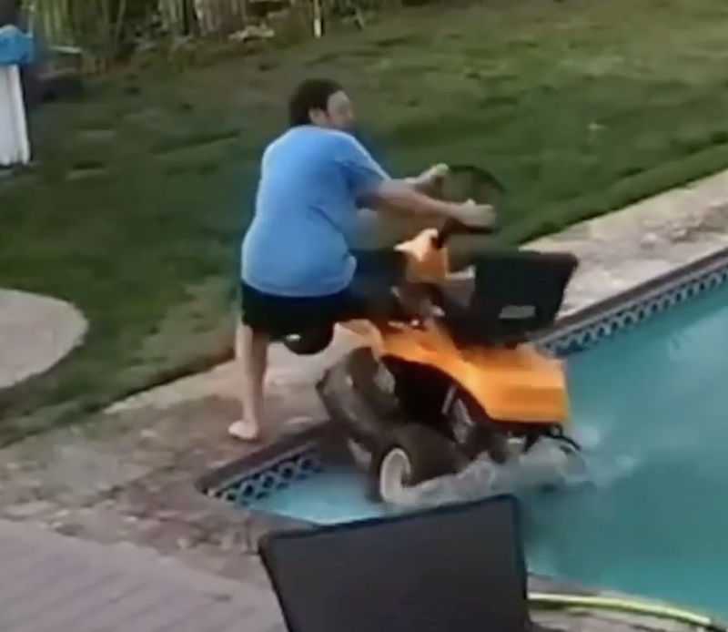 This poor guy just wanted to mow the lawn and the pool got in the way.