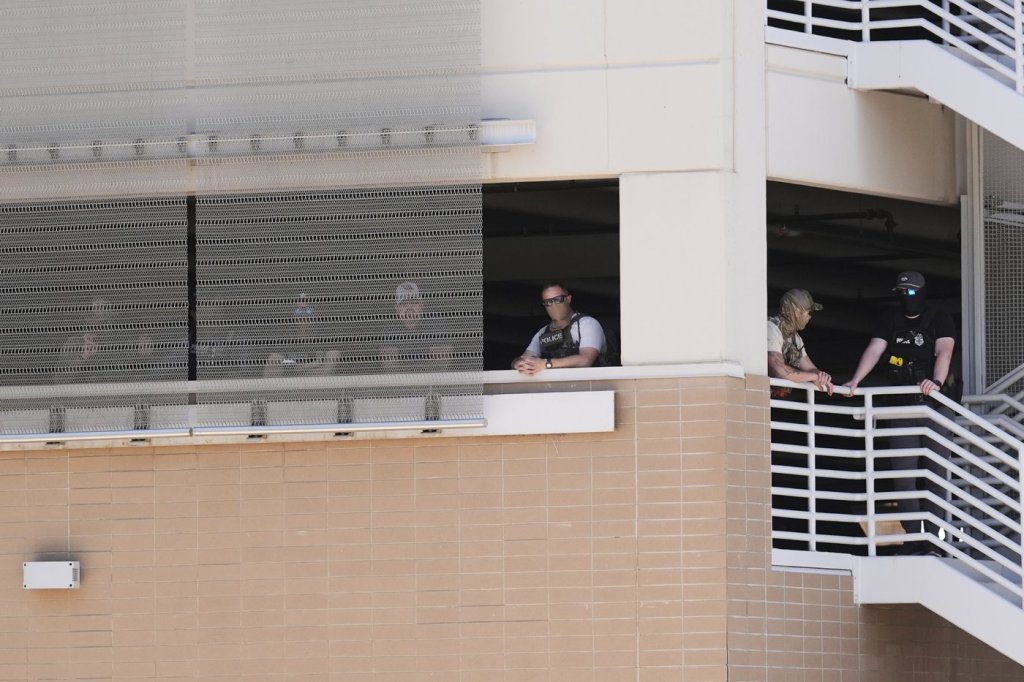 The man stepped out of the courtroom and was swarmed by officers who handcuffed him and walked him to the elevators.
