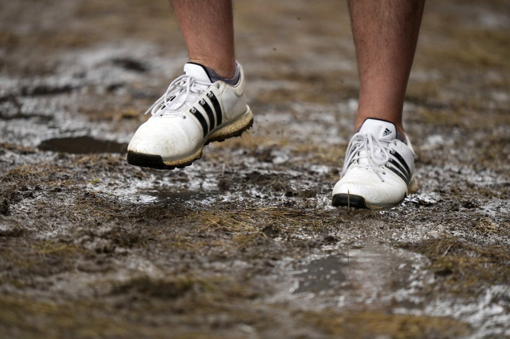 It helped that the weather came six days into tournament week, when most of the spectator areas had already been trampled down pretty firmly. Things were wet, but that didn’t stop one woman from wearing wedge shoes as she stood behind the 13th tee.