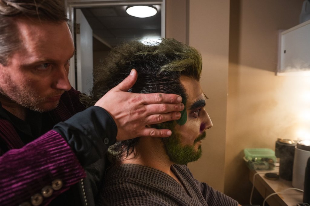 Everything about his life on the road is a routine, including the hours leading up to his nightly performance. He comes into his dressing room, surveys the fan art, and then settles into a chair as makeup artist Andrew Ozbun begins to apply his Beetlejuice face.