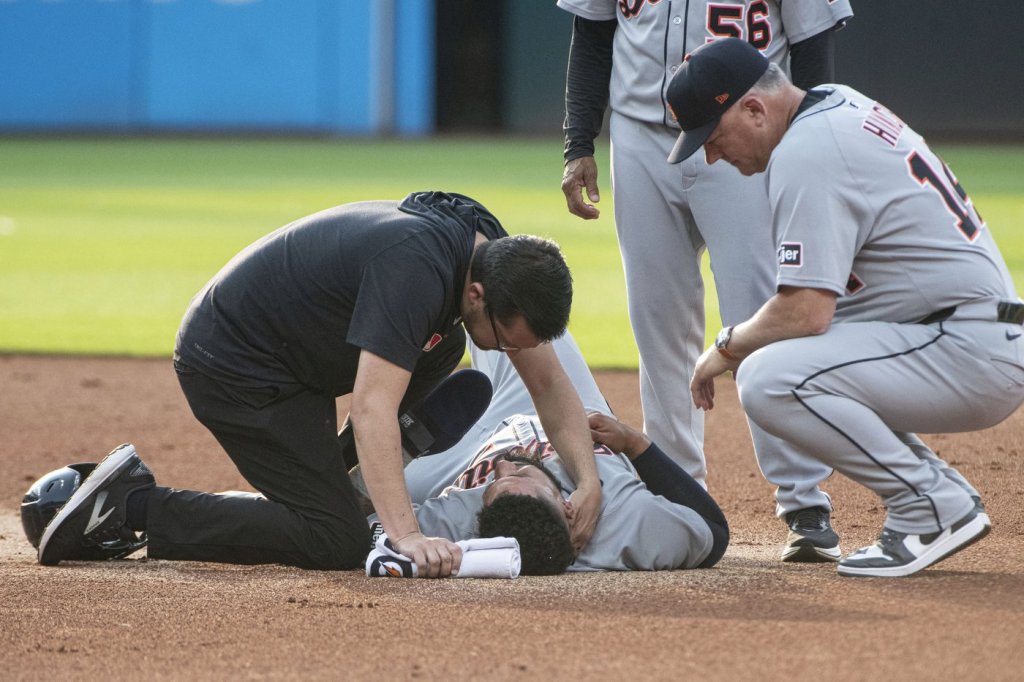 Torres got on base after drawing a walk with one out. On Riley Greene’s ground ball, Cleveland second baseman Johnathan Rodriguez flipped the ball out of his glove to Brayan Rocchio. The shortstop though was drawn off the bag as Torres slid short of second base and was belted by Rocchio’s glove and elbow as he fell.