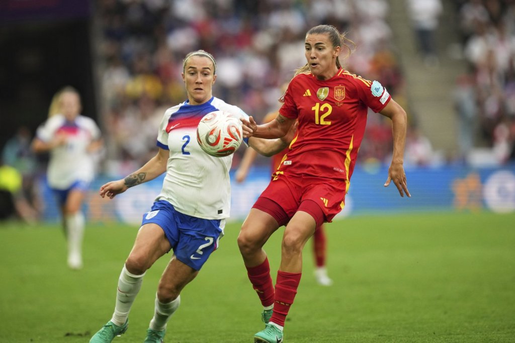 Spain’s Mariona Caldentey, left, challenges England’s Lucy Bronze during the Women’s Euro 2025 final soccer match between England and Spain at St. Jakob-Park in Basel, Switzerland, Sunday, July 27, 2025. (AP Photo/Martin Meissner)