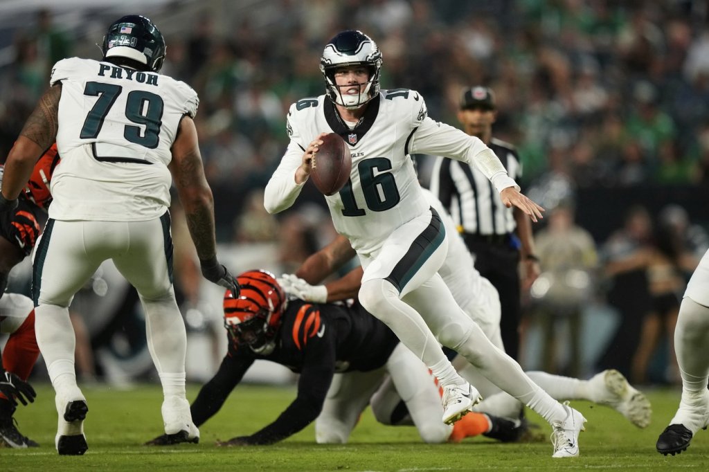 Against a Bengals team that played starters, including QB Joe Burrow and NFL receiving leader Ja’Marr Chase, the Eagles had the crowd buzzing when they assembled in the familiar formation on fourth-and-goal from the Bengals 1-yard-line on their opening drive of the game. The Eagles used their rugby-style scrum to nudge McKee into the end zone for the first — of an expected many, many more — tush push TD of the season.