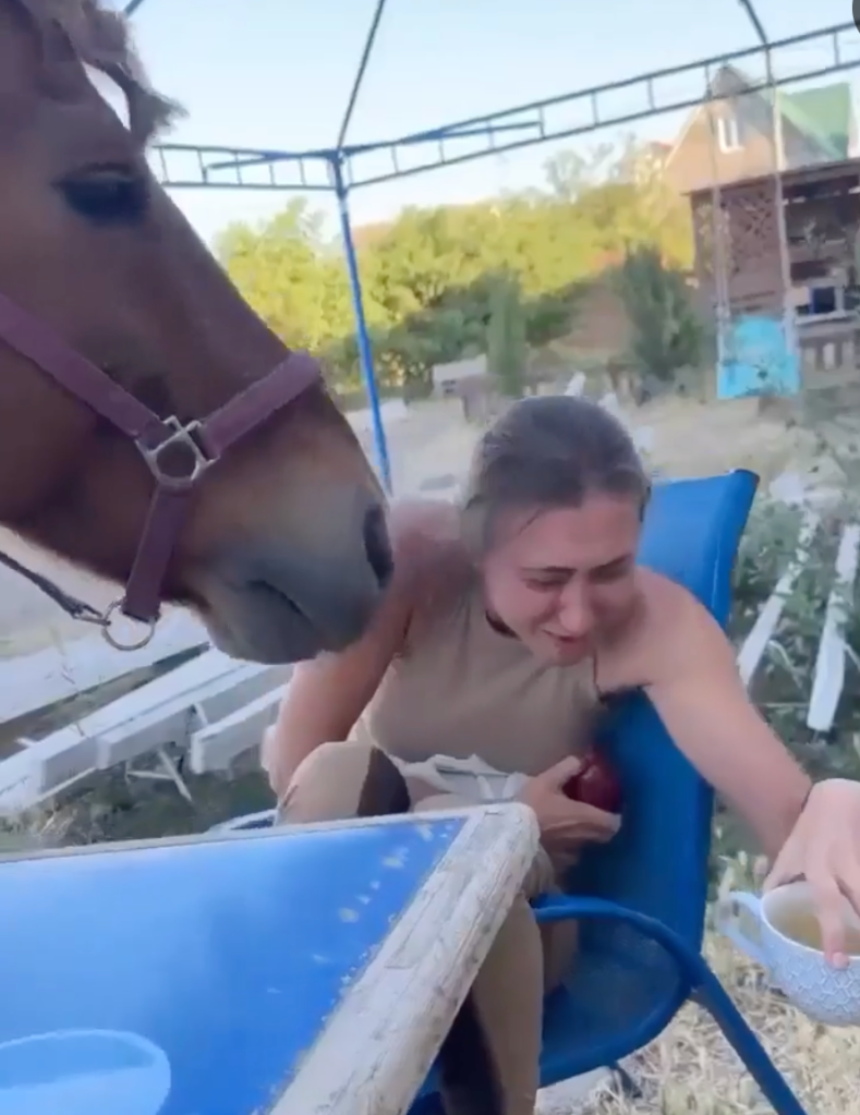 It’s literally bullying this woman to get her apple. She finally had to give in and give up her snack.