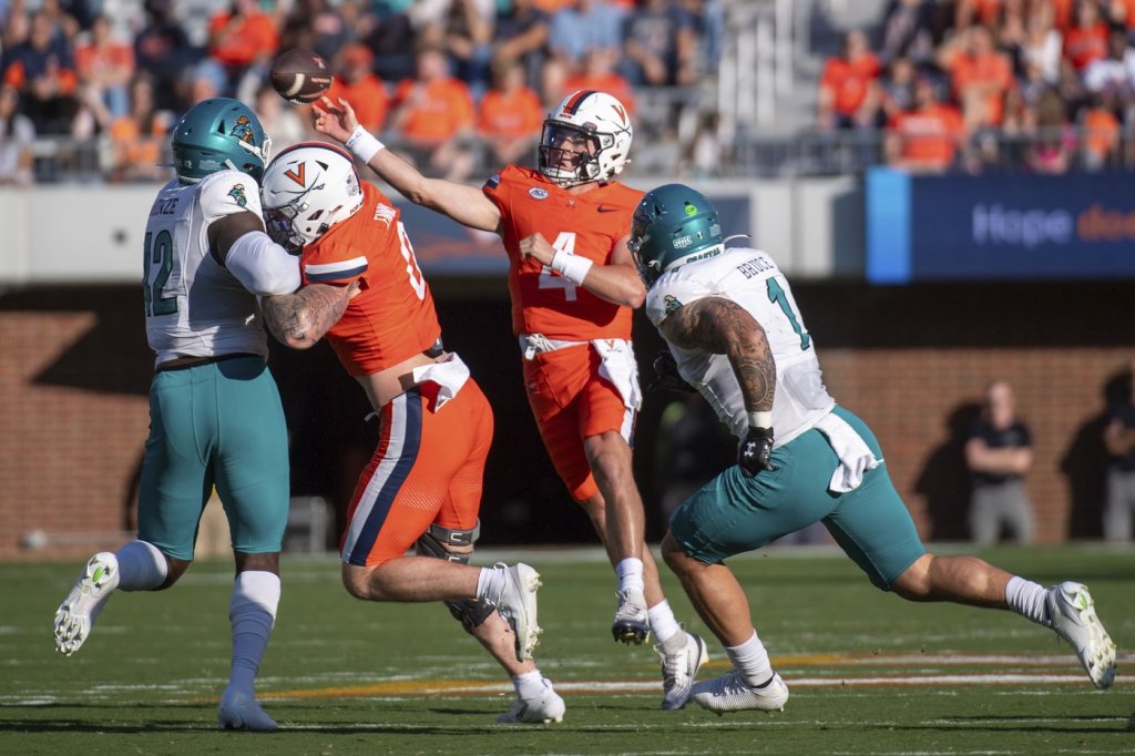 Nebraska transfer Daniel Kaelin, who had never thrown a college pass, entered the game for Morris. The Cavaliers don’t have an experienced backup. Only short-yardage specialist Grady Brosterhous has a collegiate pass on his resume.