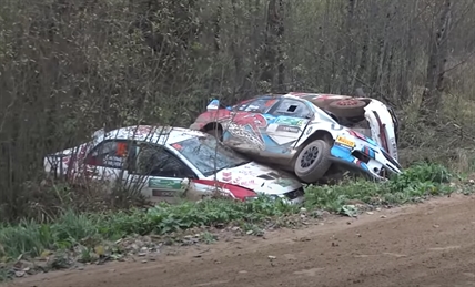 The left turn on this rally course in Russia proved to be a little too sharp for most of the drivers as they skid and roll into the ditch, one after the other after the other.