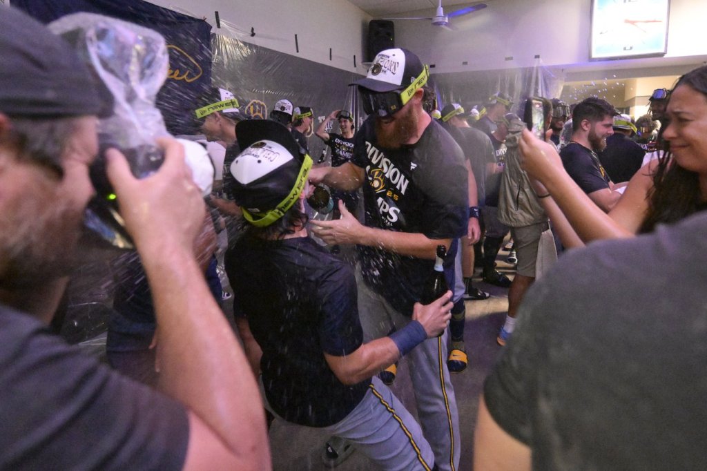 After losing 5-1 to St. Louis, the Brewers had to wait less than a half-hour before the Cubs’ game ended. The team put on navy blue “division champs” shirts, sprayed bottles of chilled prosecco and dumped cans of Miller Lite on each others’ heads.