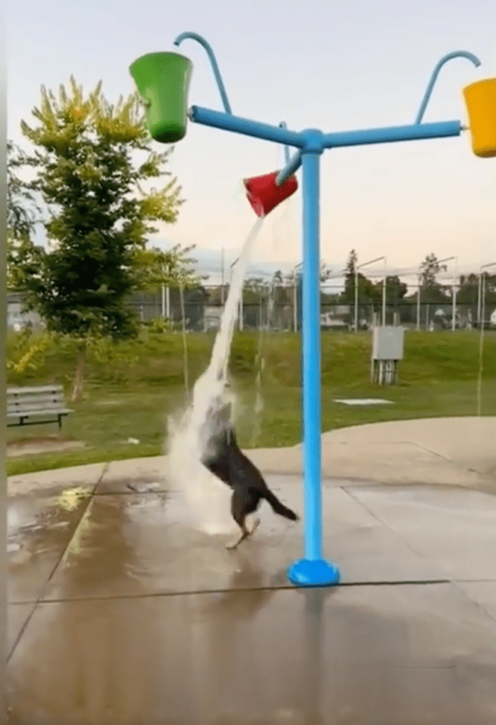 This doggo is living his best life at the local splash park.