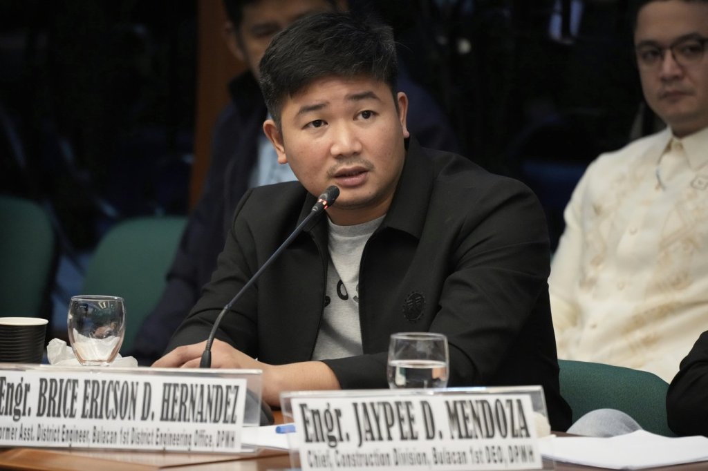 Former DPWH Engineer Brice Ericson Hernandez, third from left, speaks during investigations on flood-control projects at the Senate Blue Ribbon committee in Pasay city, Philippines on Tuesday, Sept. 23, 2025. (AP Photo/Aaron Favila)