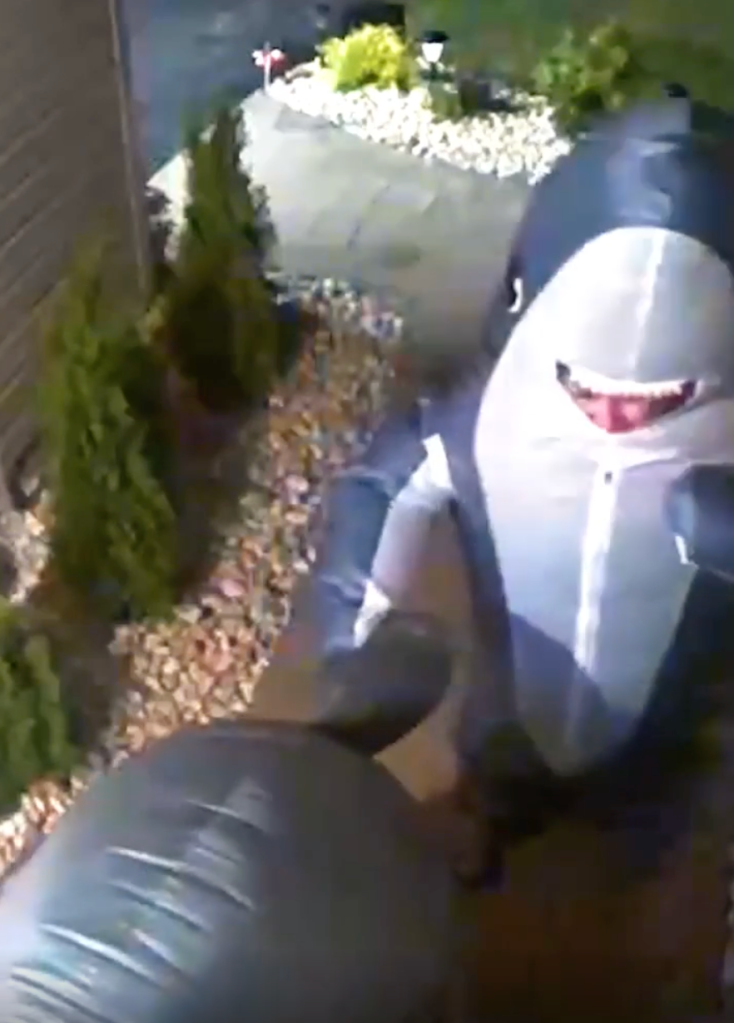 Two people in shark costumes are having trouble navigating a front porch. You gotta love doorbell cameras.