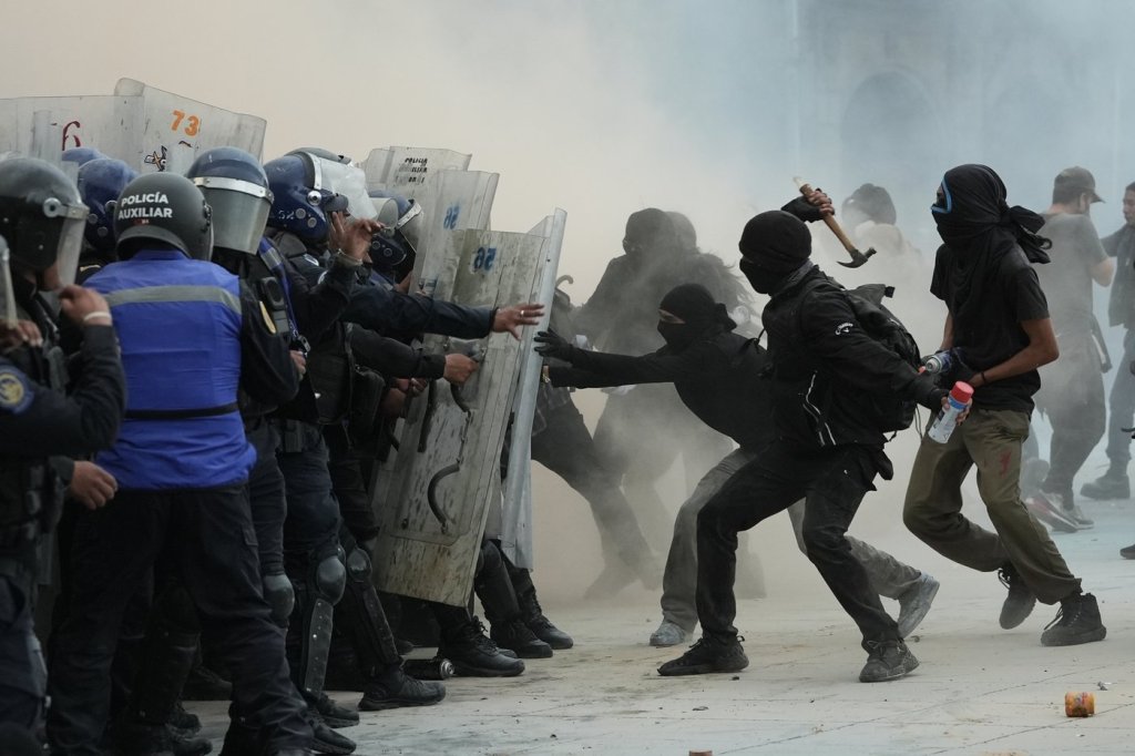 Mexico City officials estimated the march drew 10,000 people and authorities said there were about 350 who were masked and acting aggressively.