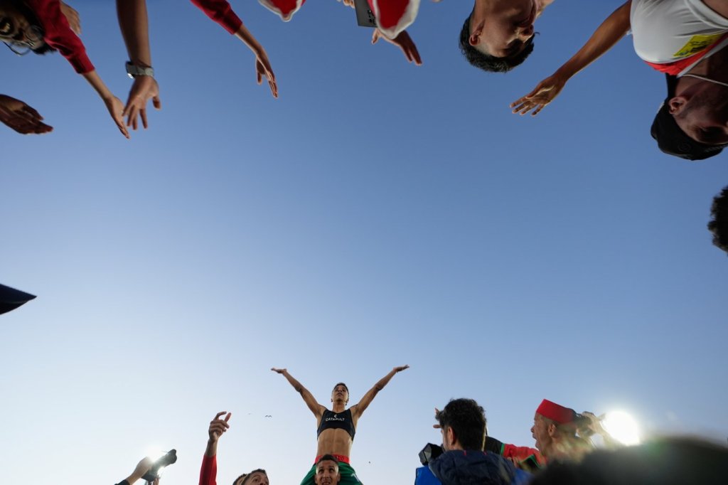 Morocco's Fouad Zahouani celebrates with fans after defeating France in a penalty shootout during a FIFA U-20 World Cup semifinal soccer match at Elias Figueroa Brander Stadium in Valparaiso, Chile, Wednesday, Oct. 15, 2025.(AP Photo/Matias Delacroix)