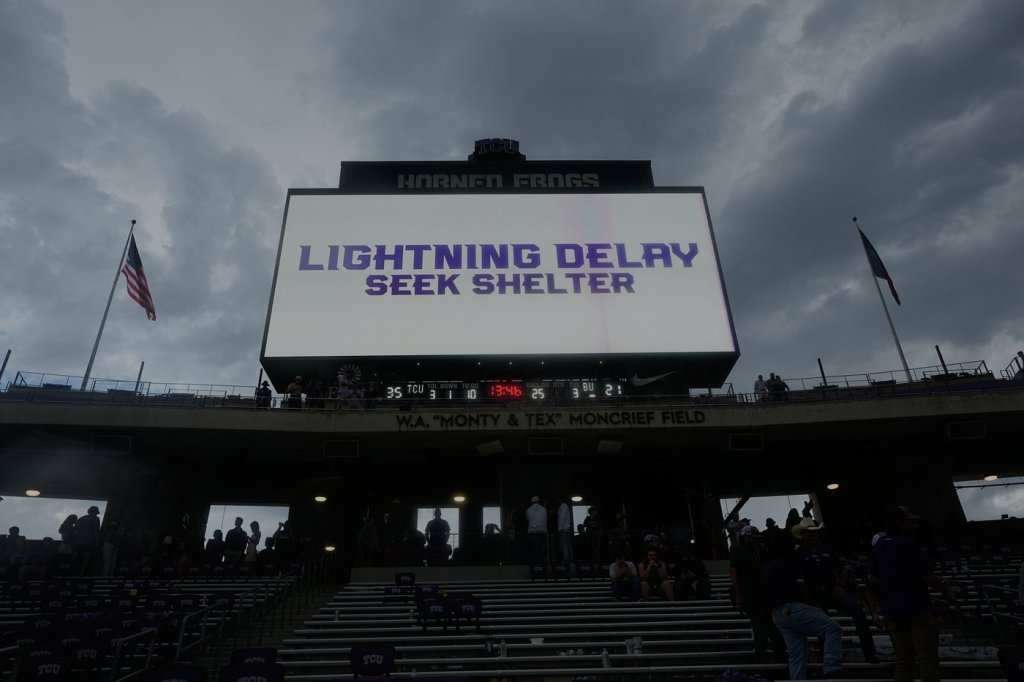 TCU had just taken a 35-21 lead on Trent Battle’s 65-yard touchdown run with 13:46 left when play was stopped the first time because of lightning detected in the vicinity of the stadium.