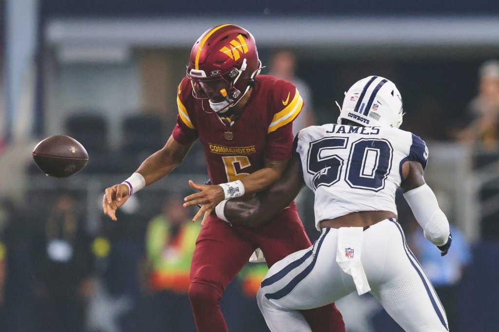 Daniels completed 12 of 22 passes for 156 yards with a touchdown before getting hurt Sunday, when the Commanders were without their top three receivers. He was sacked twice, including the first of James’ career.