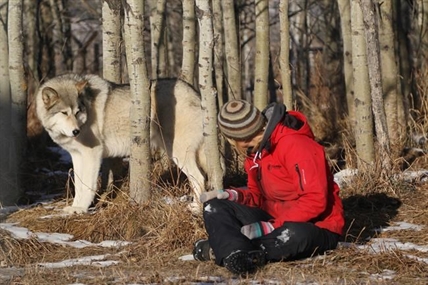 "We're going to have a visit. Please be nice," says Birch as she sits down on the ground at the Yamnuska Wolfdog Sanctuary, her three admirers licking her face and leaning against her.