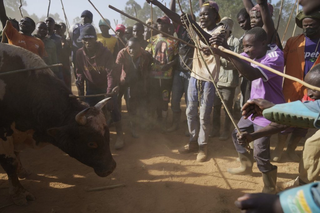 At the fighting arena, some 10 kilometers (6 miles) away, thousands wait anxiously as Shakahola and Promise arrive with pomp, escorted by fans carrying flags bearing their photos. Vendors circulate the stands, selling sticks and refreshments. The bulls are cheered on by their respective stick-waving fans.